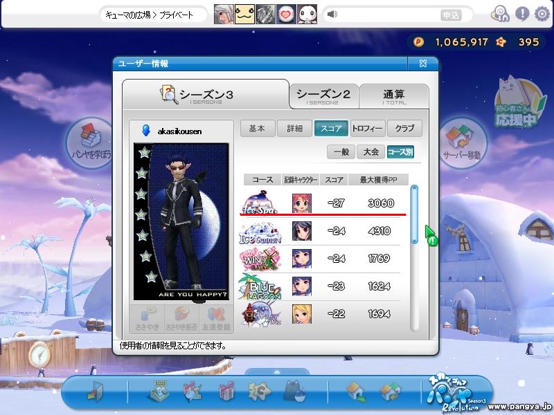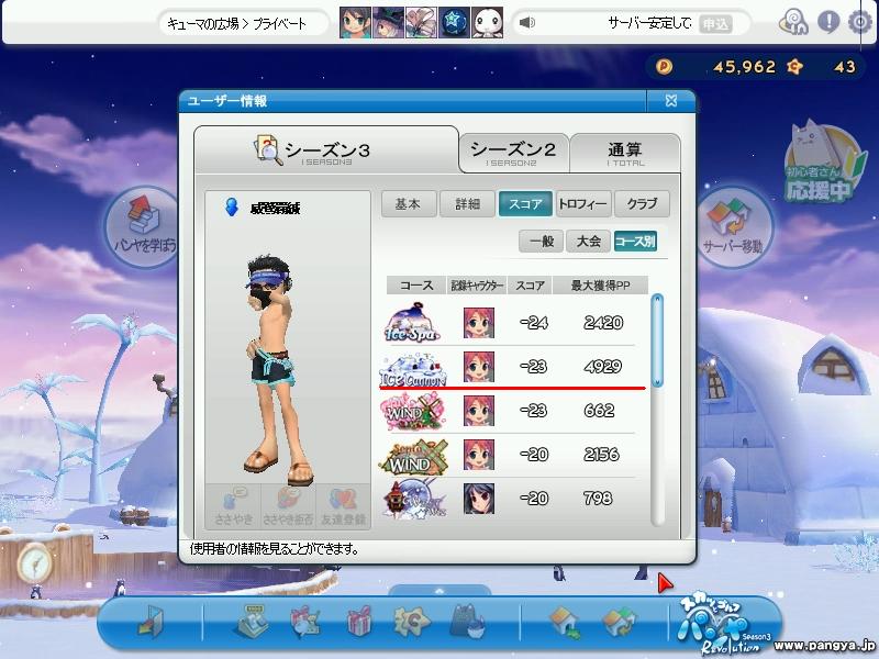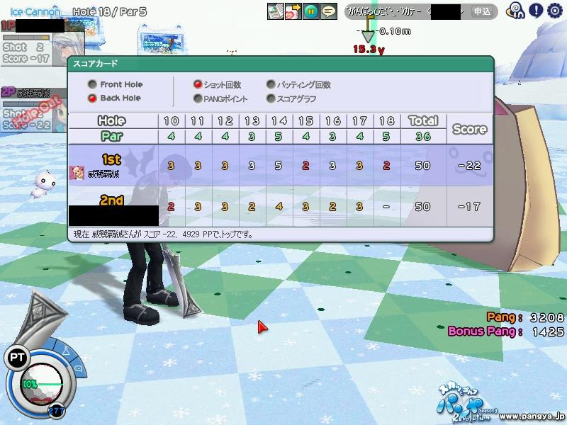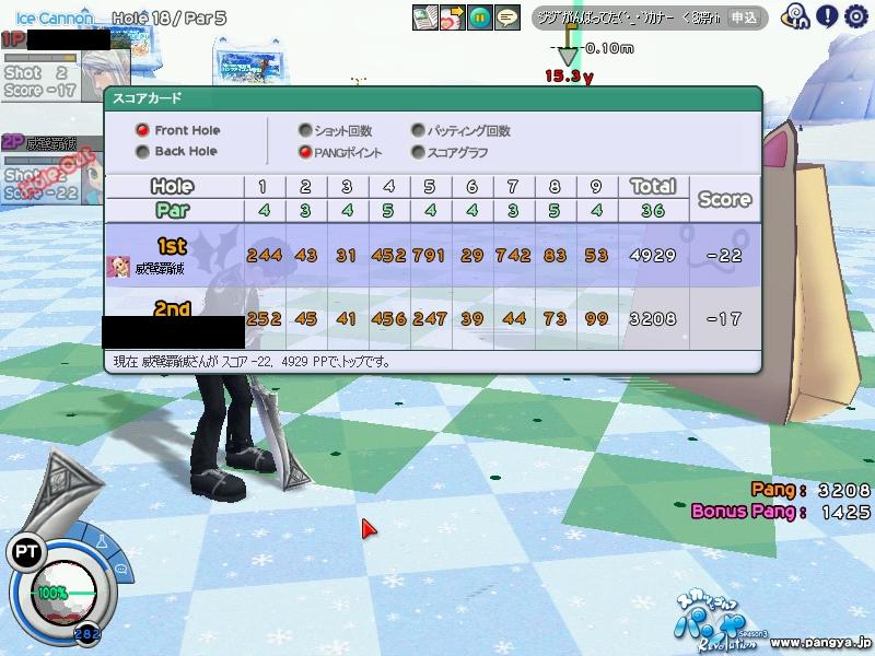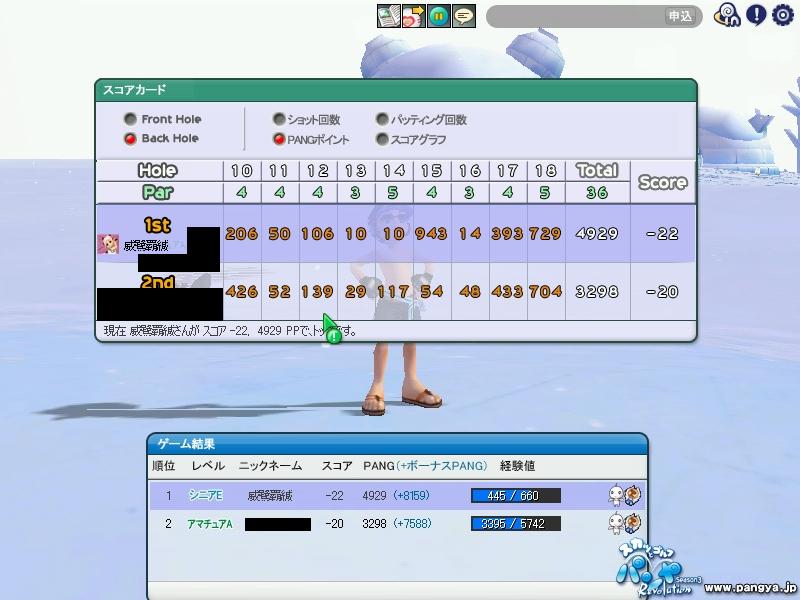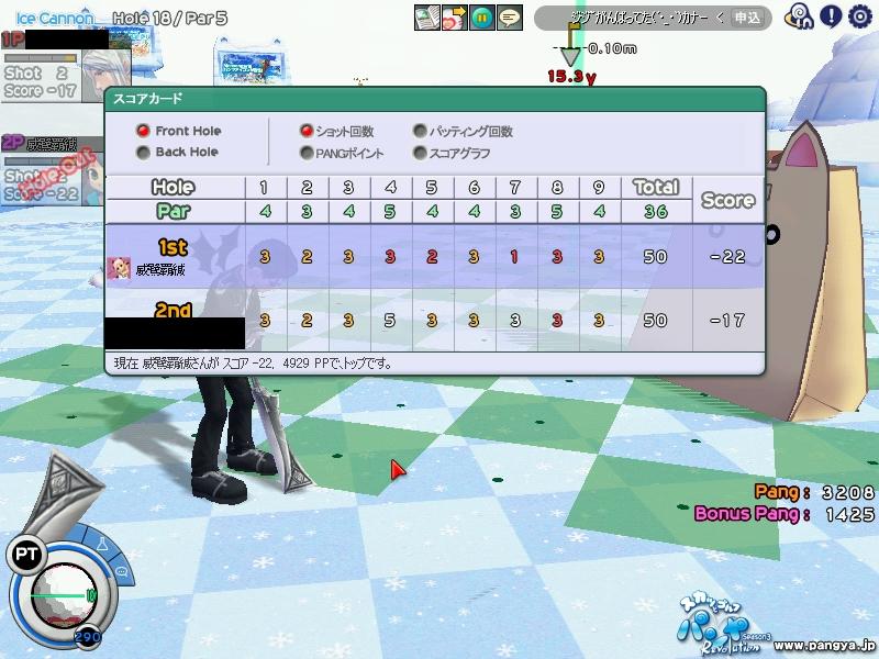 ISのPP更新! HIO 2発も出たのに スコアは更新ならず orz 本アカの話はこんなもので それよりもサブのほうが えらいことにw ICのPPを更新!! まずは前半 チップインイーグルにHIOで 前半だけで 2400越え 次は後半 1発のチップインイーグルと 定番の18Hアルバで こちらも2400越え てことで 合わせて 4929PP 本アカのスコアより 600PP以上も多いw それなのに こちらも スコアは更新ならず orz なかなか思い通りにはいかない・・・ パンヤの話はこんなもんで