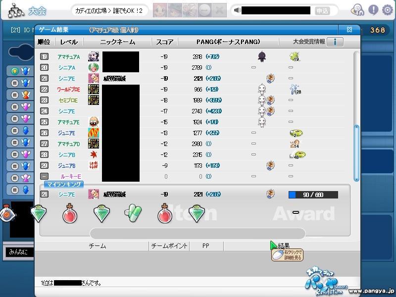 21位 本アカのときとあんま変わらない。。。 それにしてもクラマス 相変わらずものすごい高速のプレイで・・・ 何で10分台で終わるんだろ? てか アイテムまだ出んのかよw しかも出すぎww とりあえず誰にも気付かれなかったぽいww また機会があれば参加してみようかな? Then, entangle to the next days~♪