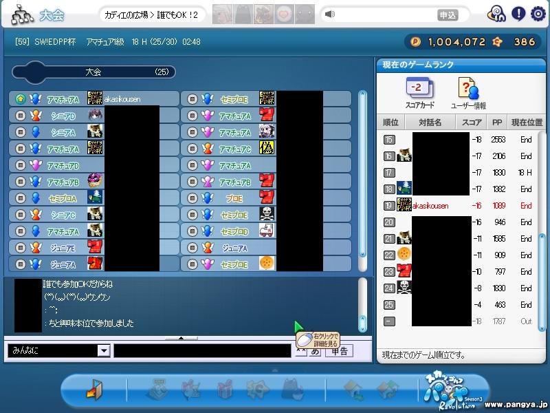 昨日は初めて EDPP杯で マスターをやりました 風がやっぱり 悪かったです orz 6 6 7 8 6 9 2 2 9 3 1 8 1 1 9 5 6 1 前半ひどいよw ずっと強風w 皆さんすみません m(_ _)m そして 1mでHIO逃した俺乙 Then, entangle to the next days~♪