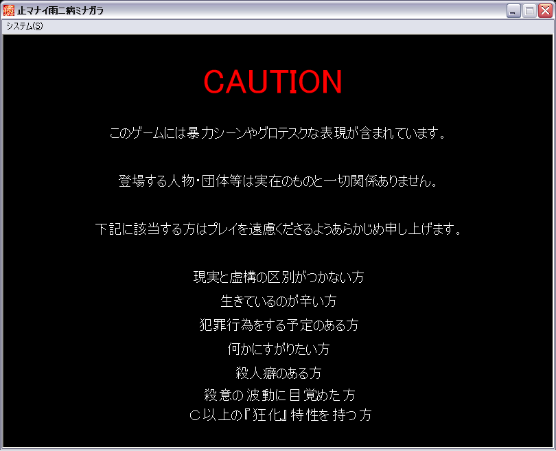 止マナイ雨ニ病ミナガラ とりあえず 最新ver.のみそぎルート終わった エンディングにたどり着くまで何度 うはwwこれww死ぬwwww と思ったことか(´・ω・) まぁ実際、選択肢ミスって 2回死んだけどwww 18禁だけど 性的表現の18禁より 暴力的表現の18禁だな(・ω・) まぁ起動画面にも書いてあるけどw C以上の狂化ってww というか、あれだな